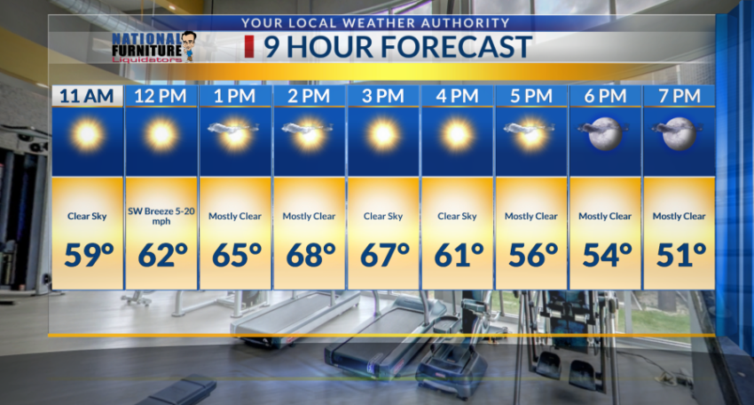 Throughout the day mostly clear skies will be forecasted. However, winds are expected to pick up from 5 to 20 mph southwest by noon.