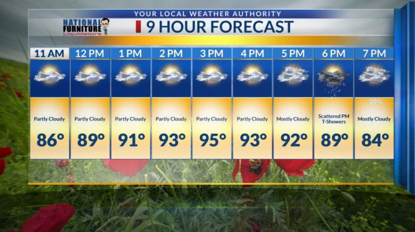 We’ll wake up with mostly sunny to partly cloudy skies going into the afternoon at 91-degrees with winds 5 to 10 mph south. Although we’re forecasting 95-degrees by 3 p.m., clouds will begin to increase in the evening with scattered thundershowers starting around 6 p.m.