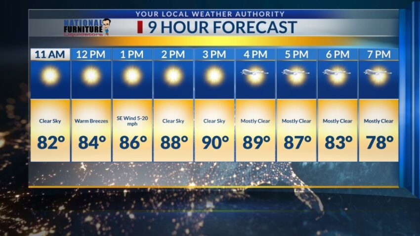 By noon, a warm breeze will come in with winds ranging from 5 to 20 mph southeast, which is perfect for outdoor activities. Temperatures will slightly drop in the 80s then in the upper 70s after 7 p.m.