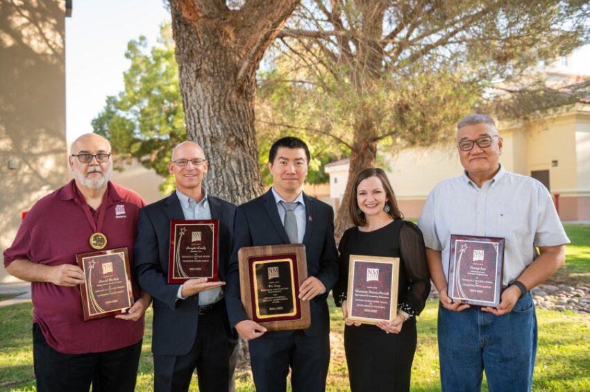 NMSU faculty award recipients from left to right: David Bishop of NMSU Grants; Dwight Kealy of the Department of Finance; Wei Tang of the Klipsch School of Electrical and Computer Engineering; Shannon Norris-Parish of the Department of Agricultural and Extension Education; and Young Lee of the Department of Mechanical and Aeronautical Engineering. Not pictured Paulette Vincent-Ruz of the Department of Chemistry and Biochemistry. (NMSU photo by Josh Bachman)