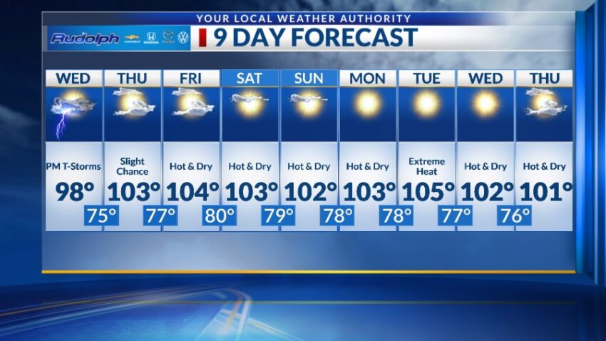 FORECAST: Wednesday will be partly to mostly cloudy and 98 with widely scattered late day t-storms. Though each storm could bring brief rainfall, the overall rain chances start to go down on Wednesday. The SW winds will range from 5-15 mph. A giant ridge of high pressure settles in for several days. Thursday will be partly cloudy and hotter with a high of 103. The chance of storms goes down to only a slight chance of isolated area t-storms. Friday will be partly cloudy and hotter with a high of 104. Saturday will be mostly sunny and 103. Sunday will be mostly sunny and 102. Monday will be sunny and dry with a high of 103. Tuesday should be the hottest day with sunshine and a high of 105.