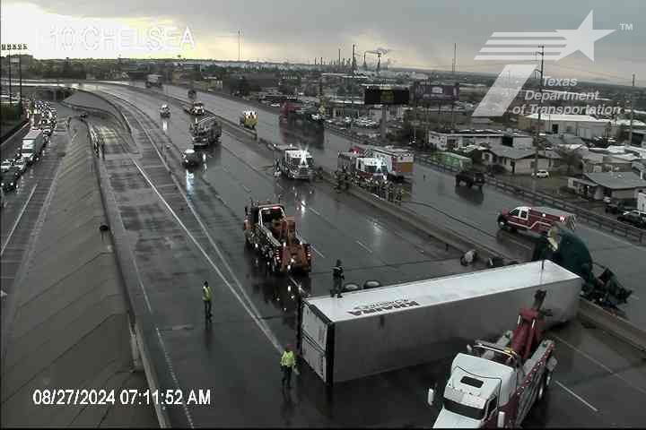 TxDOT says all lanes are currently closed westbound with traffic detouring at Exit 23B. Backup is to Trowbridge. I-10 East at Chelsea has been reduced to a single right lane of travel. Back up is to the US-54 Interchange.