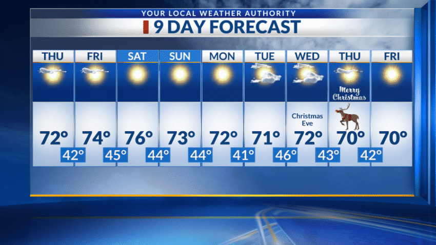 EL PASO, Texas (KTSM) — A white Christmas is out of the picture with a good portion of the southwest area experiencing warm and dry weather over the next nine days.  In El Paso, clear skies will accompany a low of around 40. Calm winds will blow throughout the night, making for a cool start to Thursday. Thursday’s high will be in the low 70s with mostly […] Read: Read More