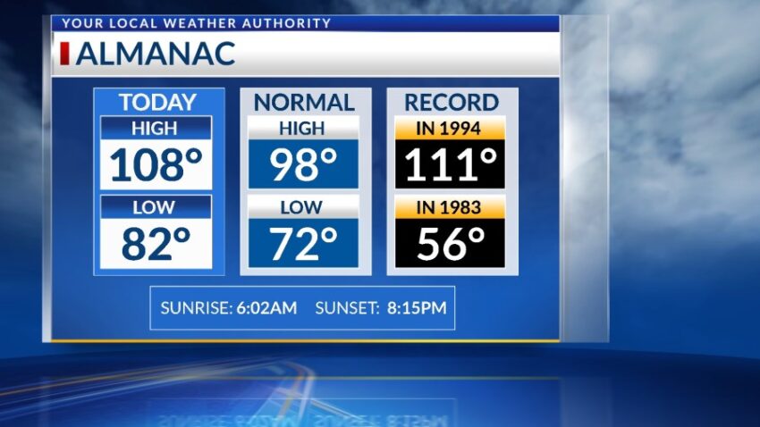Believe it or not, today was NOT a record. The official high is 108 for today, and with the high dew point temperatures, it was a miserable, “pressure-cooker” day. The record on this date is 111 set in 1994. Yes, we’ve added to the “Misery Meter.” Tomorrow, we will be extremely hot again, but we have an excellent chance of potentially strong t-showers by evening.