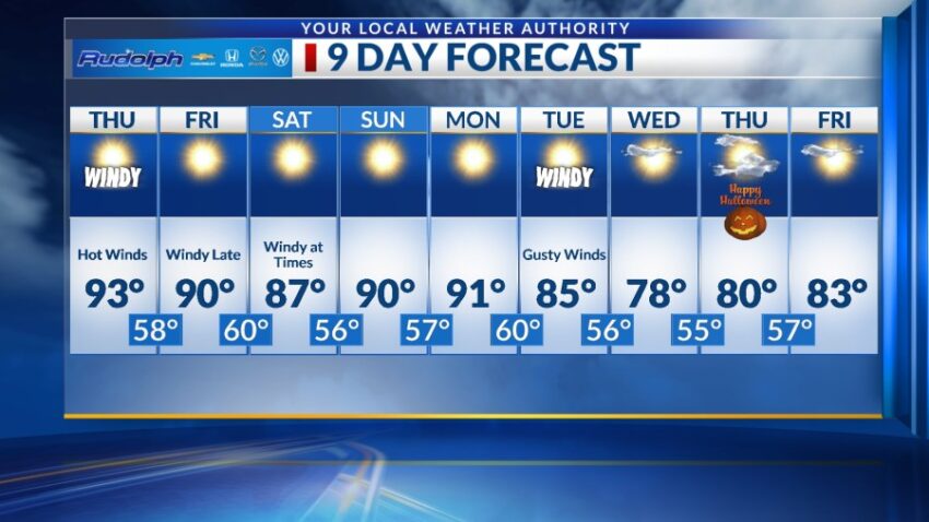 FORECAST: Thursday will be sunny and moderately windy with a high of 93. The SW-west winds will pick up in the afternoon and gust to near 30 mph, stronger on the east slopes. Friday will be mostly sunny with a few clouds and a high of 90. Most of the day Friday, the winds will be light and variable. Late Friday evening, the winds will begin to pick up on the west slopes with an advancing “cool front.” The east winds will gust to near 25 mph at the airport. Saturday will be sunny and a little windy at times, especially in the morning. Saturday’s high: 87. Sunday will be mostly sunny and 90 with light winds. Monday will be sunny with light winds and a high of 91. Tuesday will be quite windy. The west winds will gust to near 40 mph as a mild cold front blows in. We could see a dusty haze Tuesday with a high of 85. Wednesday will be mostly sunny to partly cloudy with a high of 78. Halloween will be partly cloudy and 80.
