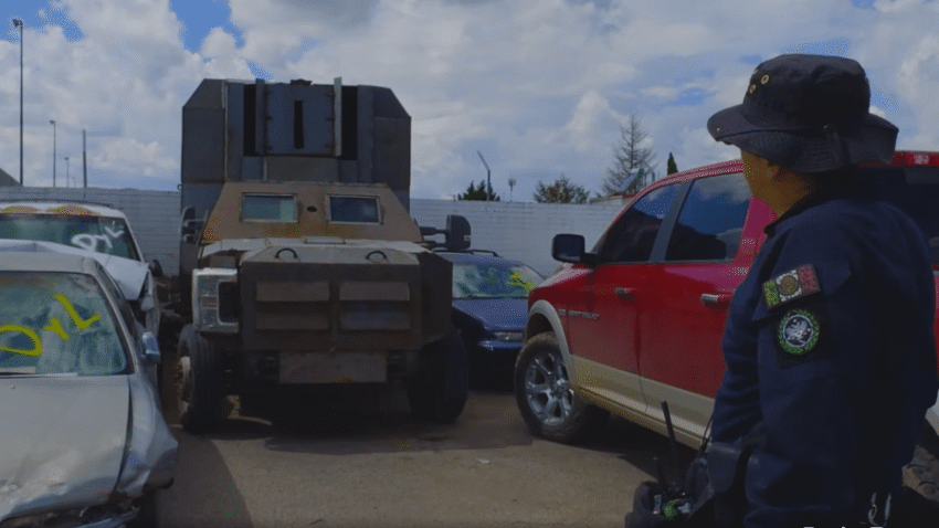 The seized cartel armored truck sits inside Chihuahua police impound lot.