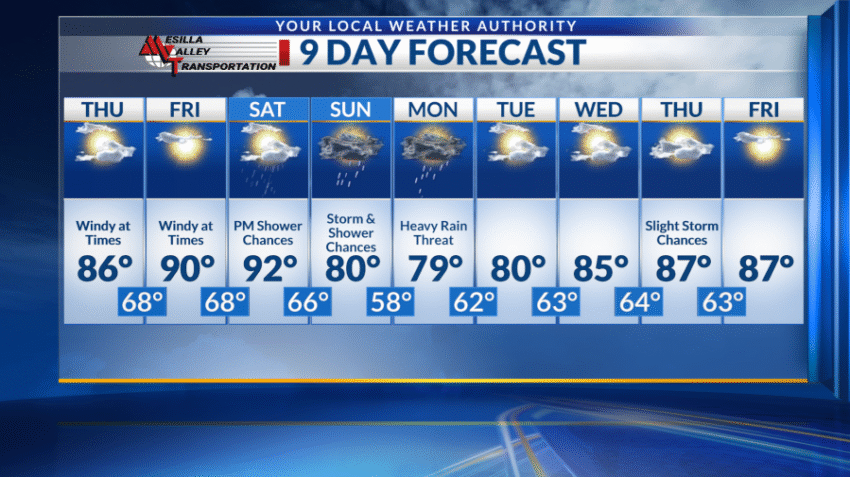 Thursday and Friday will be similar, with some clouds and highs in the mid-80s. Winds and gusts will pick up during these days, gusts reaching speeds near 25 mph. Overnight lows will be in the mid-60s with partly cloudy skies.