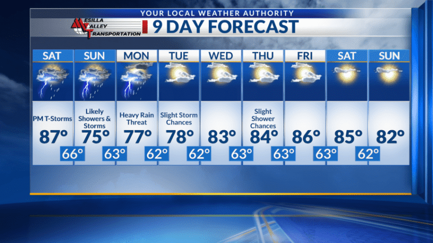 On Sunday, the showers and storms continue as temperatures drop to the mid-70s. The low will be around 65 with storms continuing just before midnight.