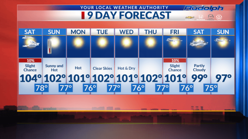 Saturday’s high is expected to reach a scorching temperature of 104 degrees with an overnight low sitting at 78 degrees.