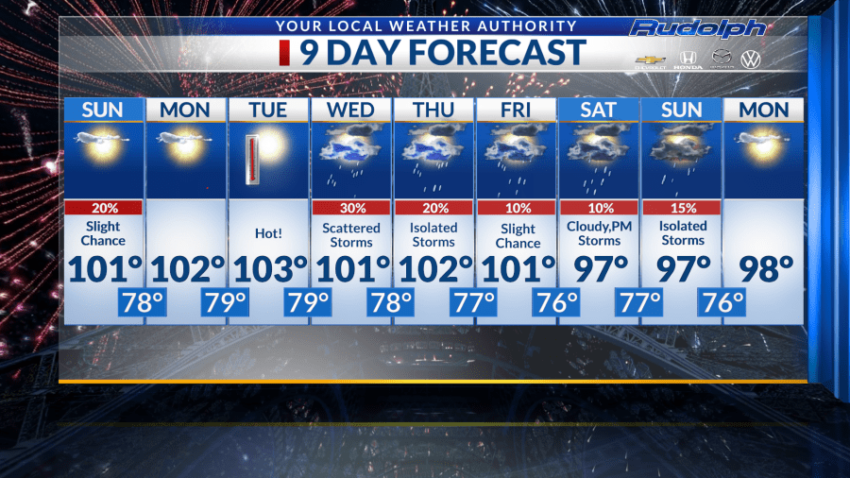 Friday, we are expecting a 10% chance of storms. We are still on that triple-digit streak as we expect to reach 101 for our high.
