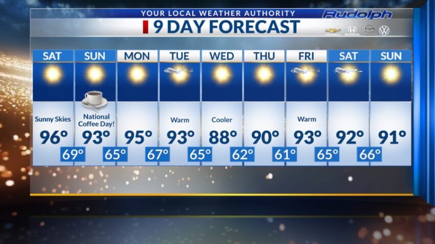 Sunday is National Coffee Day, and the weather will be a repeat of Saturday’s. Once again, we’ll enjoy sunny skies and highs in the 90s, with light winds up to 10 mph. By Sunday evening, temperatures will cool off to a comfortable 65 degrees.