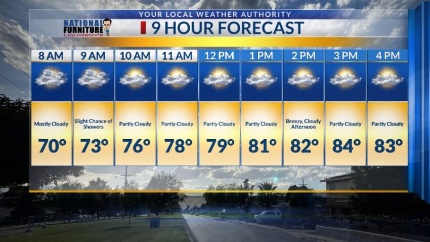 You could really feel the difference in humidity today. Dew point temperatures increased to the 50s, and that additional tropical moisture will give us a chance of t-showers tonight. That chance of rain thins out for Wednesday with only a slight chance of showers. Here’s your exclusive 9-Hour Forecast for Wednesday will your 9-Day Forecast below.