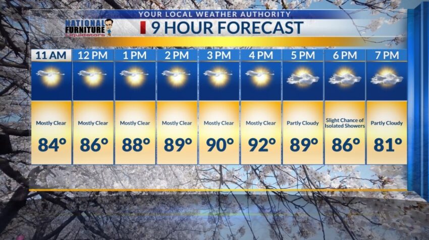 With winds ranging from 10 to 15 mph east throughout the day, expect a high of 92-degrees by 4 p.m. Starting the morning with mostly clear and mild temperatures, partly cloudy skies are predicted to surface through the area with a slight chance of isolated showers around dinner time.