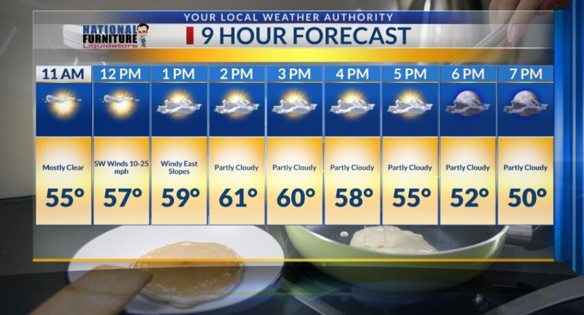 By 1 p.m. we’re predicting windy east slopes with those upper 50s. Starting at 2 p.m., we’ll begin to feel temperatures as low at 60 degrees. However, in the evening we’ll begin to cool down to the low 50s again. ⛅