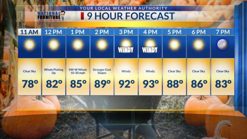 However, winds will be a bit stronger from yesterday at 10 to 30 mph southwest to west around 1 p.m. and continue throughout the day. Stronger east slopes are predicted at 2 p.m. with a high of 93-degrees at 4 p.m.