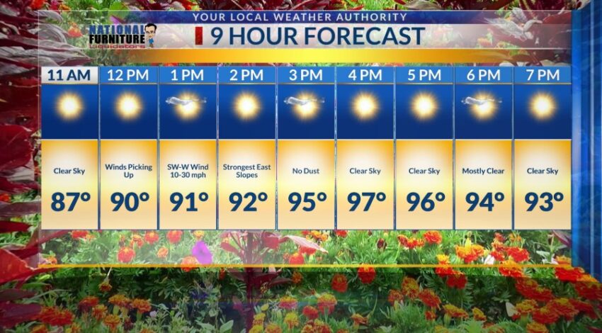 Southwest to west winds will pick up by noon, ranging from 10 to 30 mph. Although there is no dust on our radar, the strongest east slopes will begin at 2 p.m.