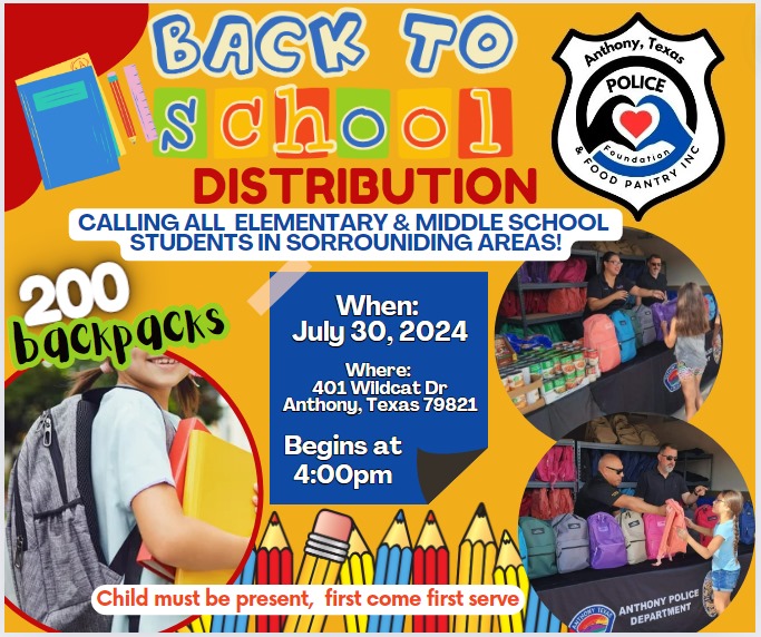 The School Supply Backpack Giveaway is open to children from Anthony, Texas, Vinton, Canutillo and Anthony, New Mexico. The first 200 children to attend with a parent or guardian will receive a backpack filled with school supplies, according to the Anthony Texas Police Foundation.
