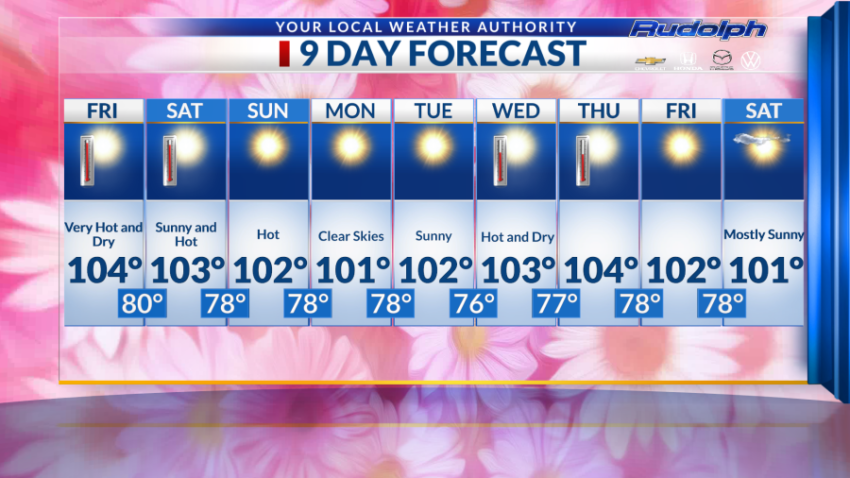 For the remainder of the week, we will continue seeing the triple digit pattern. Monday and Saturday are expected to be the coolest days of the week at 101 degrees.