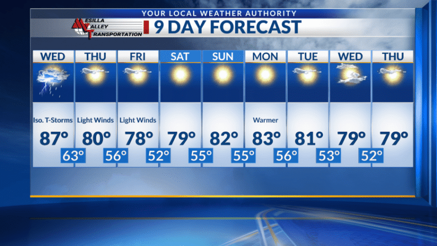 Wednesday, we can expect a warmer high in the upper 80s with mostly sunny skies during the day. Winds will be around 10-15 mph with gusts reaching speeds near 20 mph at times. In the evening, isolated storm chances remain with a low in the low 60s.