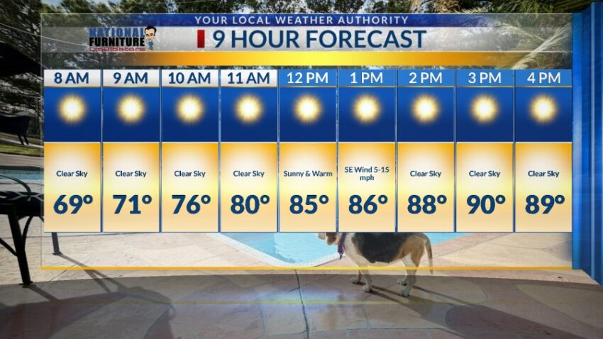 With a high of 92 today, this should be the hottest day of the week, even though we stay above normal through the next 9 days. Normal this time of year is 84. The record for today is 96 set back in 2015. We cool ever so slightly for Friday. Here’s your exclusive 9-Hour Forecast with your 9-Day Forecast below.