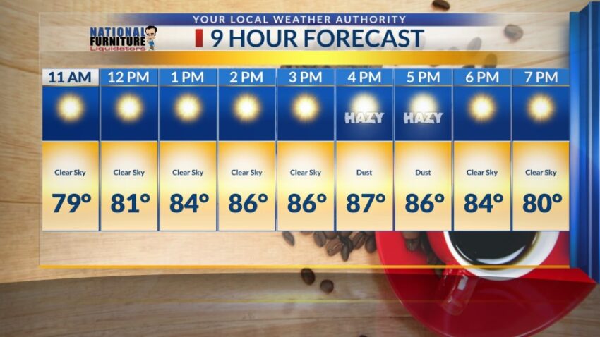 Patchy blowing dust is expected with west winds ranging from 15 to 25 mph by noon. Around 4 p.m. and 5 p.m. hazy skies with dust will linger with temperatures in the mid-80s. 🌤💨