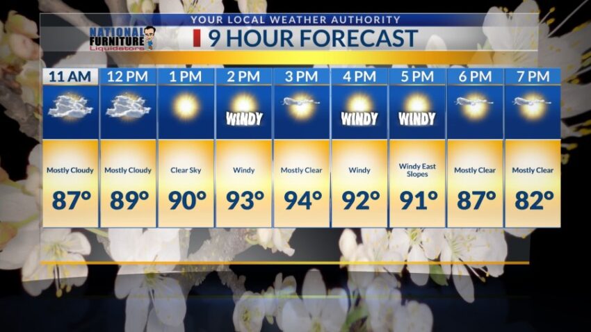 The morning will be mostly cloudy with west winds expected to range at 10 to 15 mph and windy east slopes by 5 p.m. Skies will clear up around 3 p.m. with a high of 94-degrees.