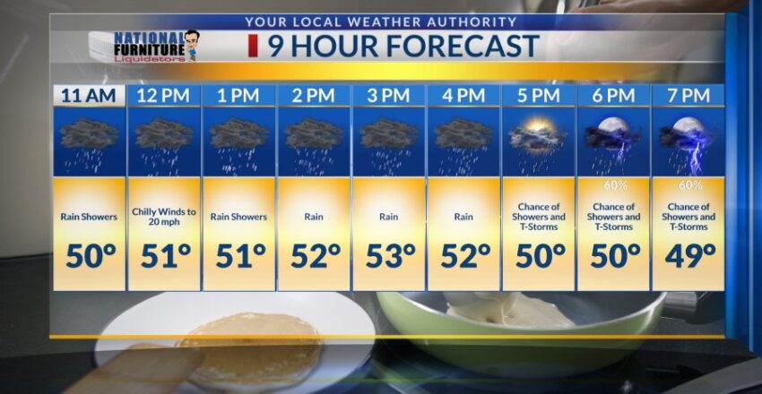 By tonight, we’re forecasting a 60 percent chance of showers and thunderstorms with 50 degrees, dropping down to the mid 40s.