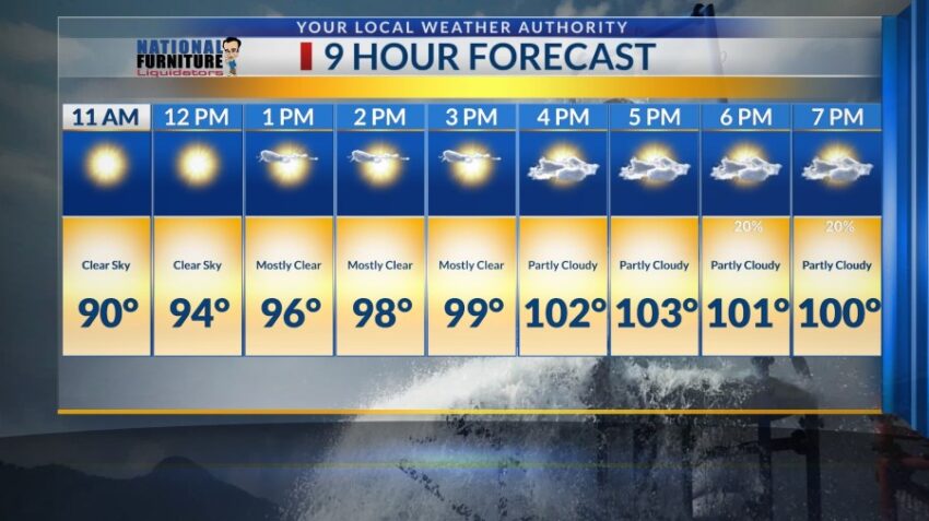While mostly clear skies will last all morning and noon, expect partly cloudy skies to come around at 4 p.m. with a high of 103-degrees.