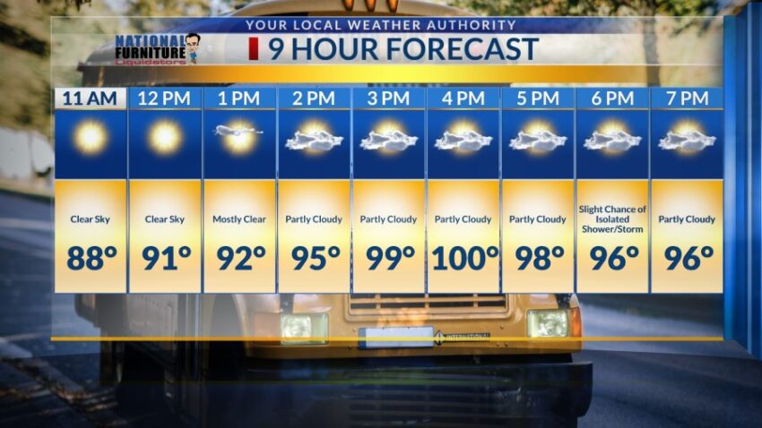 While it is only the second day of back to school for some students, the morning will start warm around the upper 80s. By noon, temperatures will pick up in the mid-90s but eventually reach a high of 100 degrees by 4 p.m.