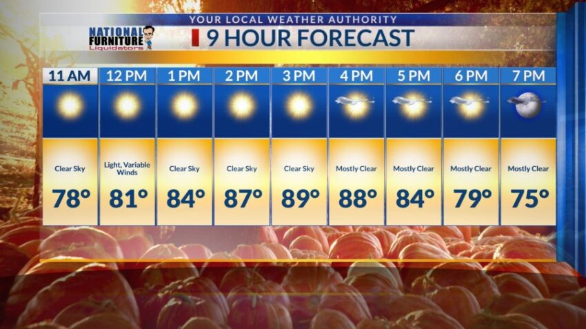 Starting the morning chilly in the upper 50s, temperatures will slowly rise in the upper 70s by 11 a.m. Light variable northeast winds are expected at 5 to 10 mph. The skies will stay mostly clear with a high of 89-degrees by 3 p.m.