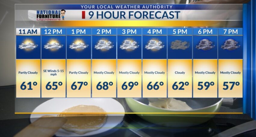 By noon, we will begin to feel southeast winds ranging from 5 to 15 mph paired with partly cloudy skies.