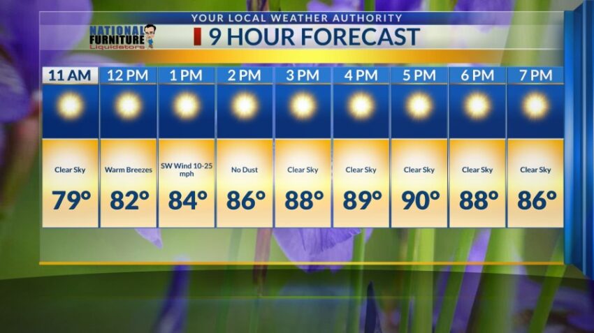 We’re predicting a high of 90 degrees by 5 p.m. with southwest winds from 10 to 25 mph starting at 1 p.m. Luckily, we’re not forecasting any dust.