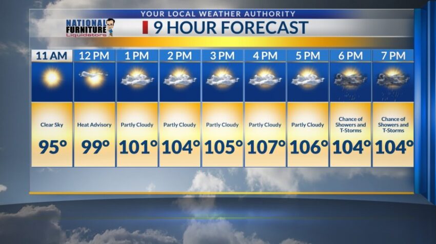 With triple digits lingering today, we expect to be at 108-degrees. Make sure to dress appropriately for the weather as temperatures may cause heat illness. Drink plenty of water and try to stay in air-conditioned rooms.