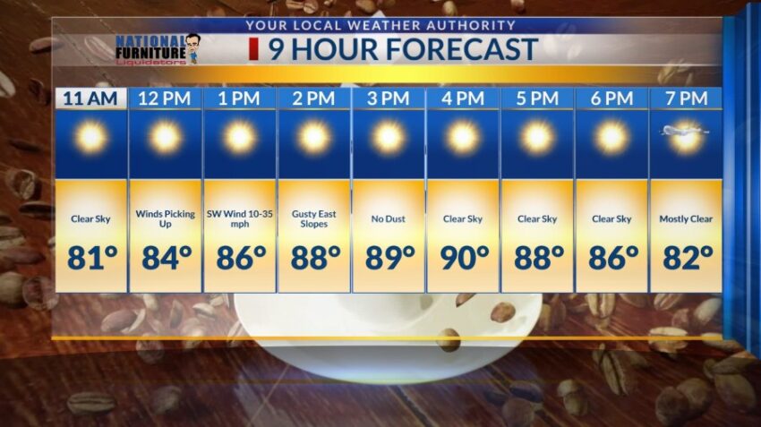 We’ll start off the morning mild with clear skies and winds picking up by noon. Southwest winds ranging from 10 to 35 mph with temperatures in the mid 80s.