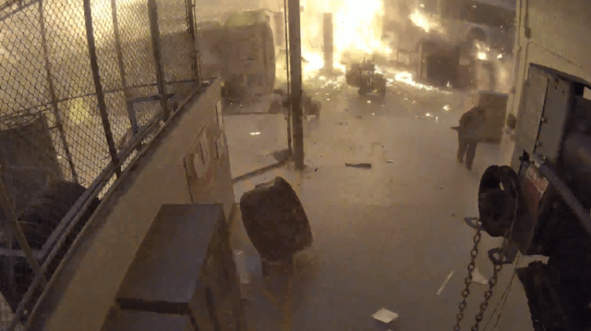 From another angle inside the facility, multiple people seen running away from the explosion. Large plumes of black smoke and flames are seen intensifying throughout the warehouse.