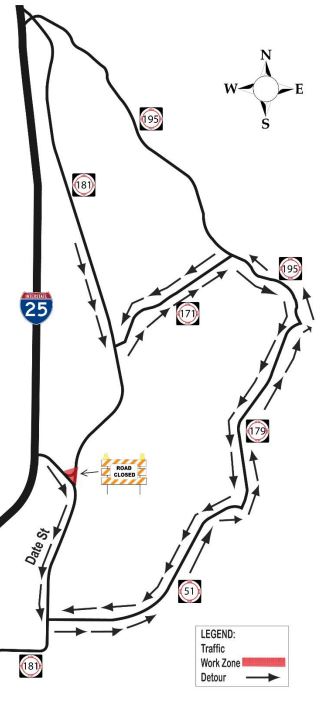 Southbound traffic on NM 181 will head east on NM 171, then south on NM 195 to NM 179 and NM 51 and then north on Date Street.