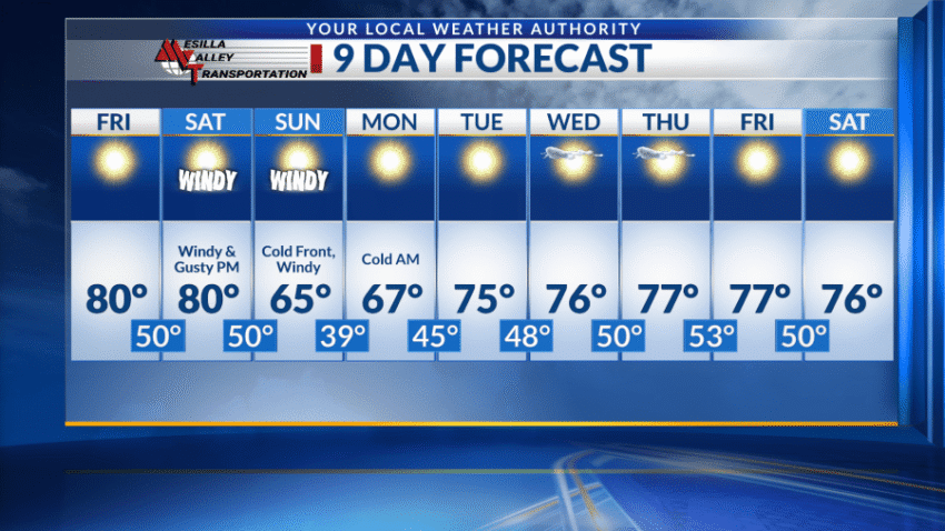 Friday and Saturday will feature highs in the low 80s with sunny skies. Wind speeds will increase Saturday night to 10-20 mph, gusts around 30 mph.