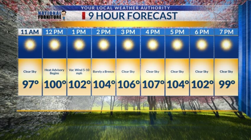There will be a slight breeze throughout the day but expect those temperatures to rise to 107 by 4 p.m.