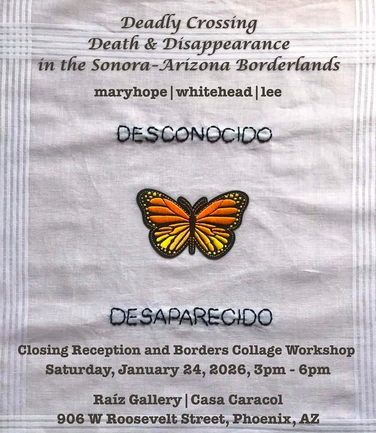At Casa Caracol’s Raíz Gallery, artist maryhope | whitehead | lee’s solo exhibition, “Deadly Crossing: Death and Disappearance in the Sonora|Arizona Borderlands” is on view through Saturday, January 24. There will be a closing reception and borders collage workshop that day from 3-6 p.m.