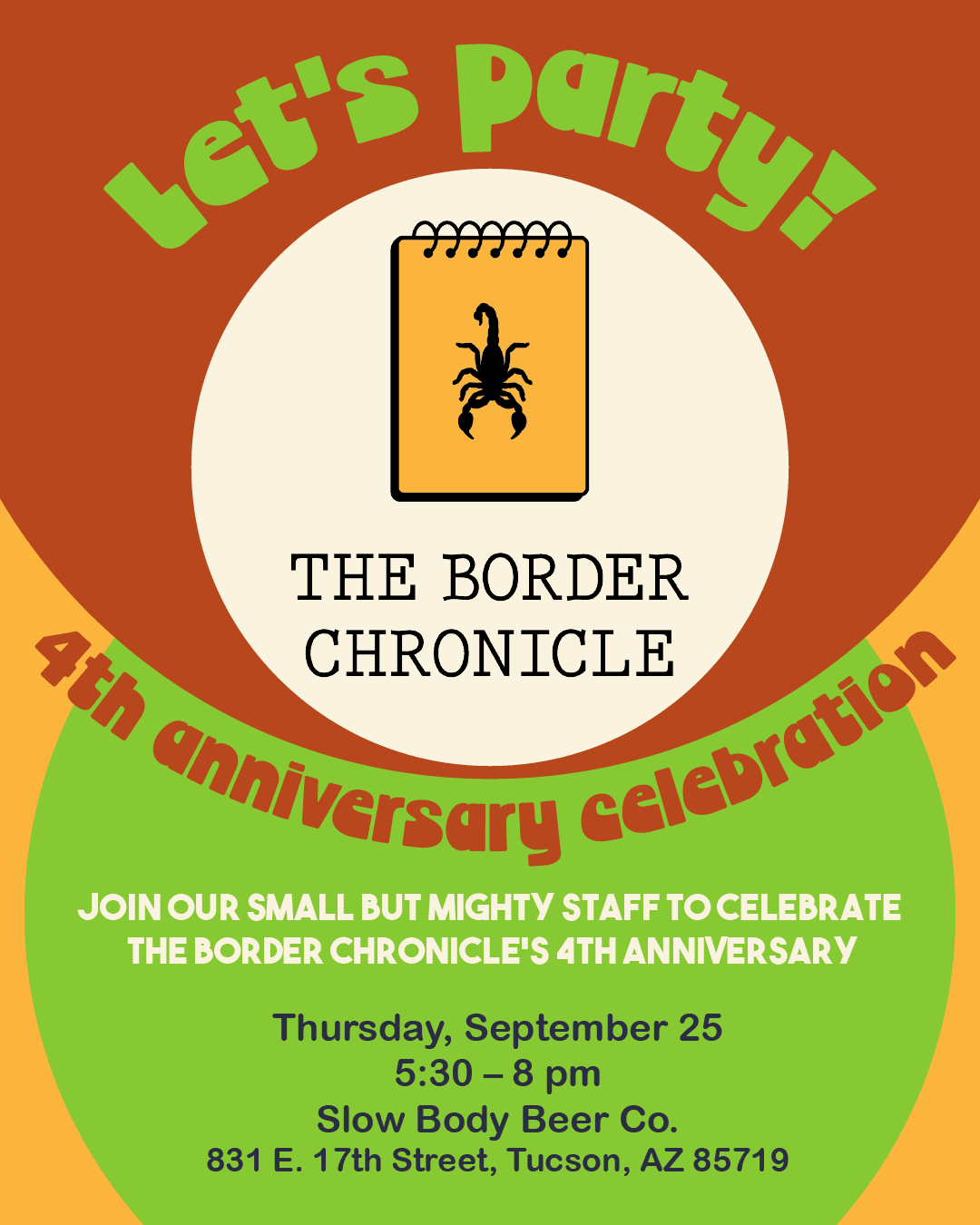Finally, let’s celebrate! If you’re in Tucson on Thursday, September 25, please join us for our fourth anniversary celebration at Slow Body Brewery from 5:30 to 8:00 p.m. The Border Chronicle’s small but mighty staff will be there, so please come by, say hello, and celebrate with us.