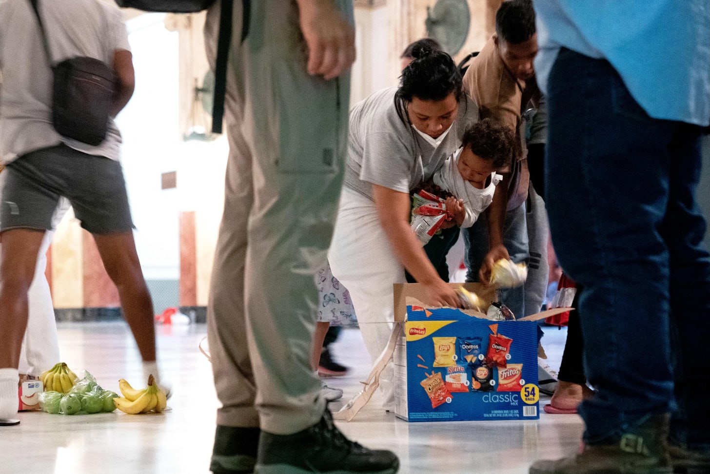 Migrants from Venezuela collect snacks at Union Station in Washington DC in August 2022 after being bussed there by Texas Governor Greg Abbott. (Photo by Stefani Reynolds/AFP via Getty Images)