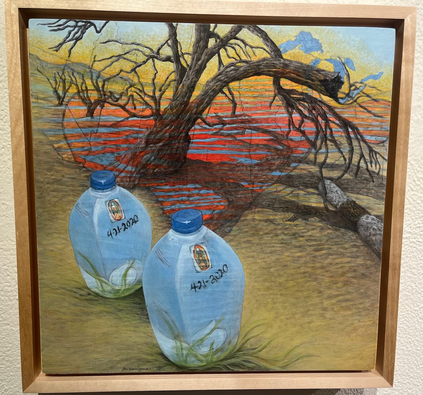 A painting by Susan Lyman, photographed in January at the Tohono Chul gallery in Tucson at her exhibit, Postcards from the Border. “I am documenting my visceral reaction,” the longtime artist says, “to the environmental destruction, death, inhumanity, and militarization at the border.”