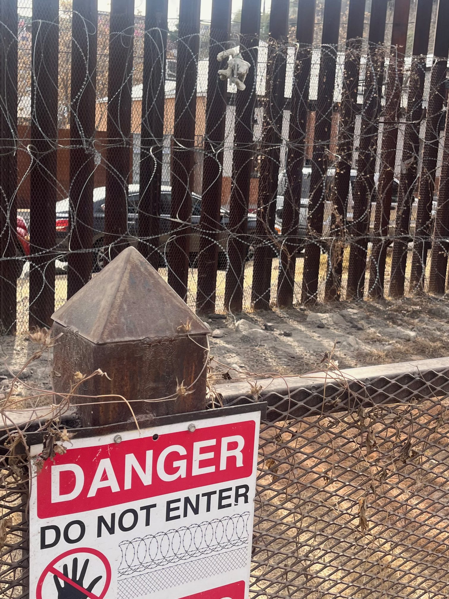 The border exists as part of a persistent narrative of fear. Look closely at the coiling razor wire, and you’ll see an ensnared teddy bear. Another Inauguration Day photo.