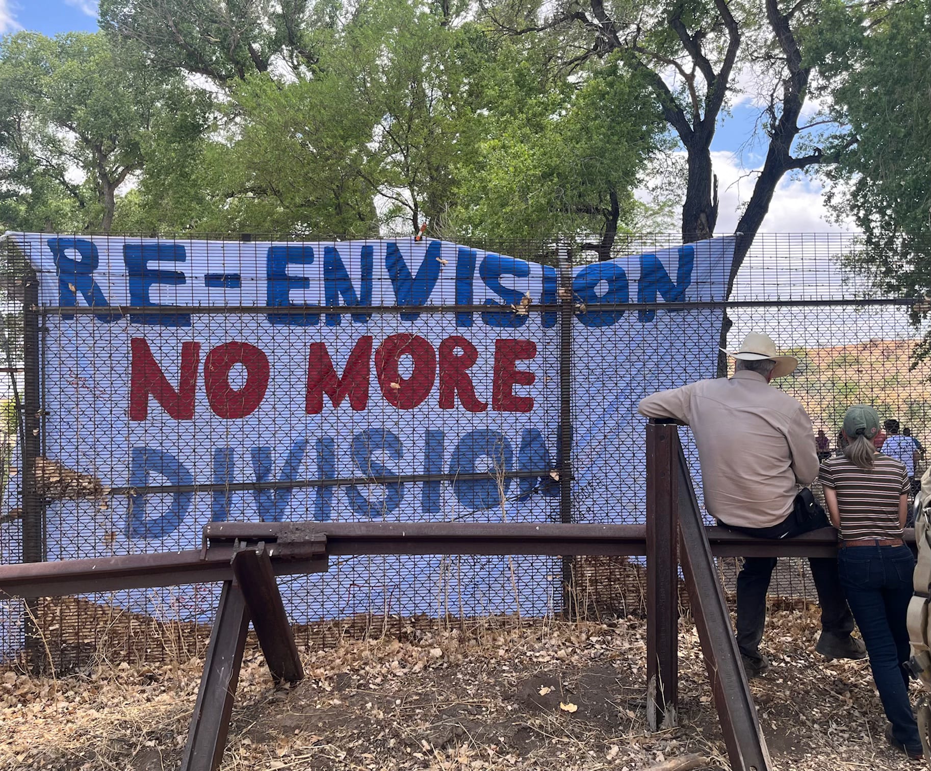 A cross-border celebration called the Binational Border Happening took place in Lochiel, Arizona, on May 31. The event protested the Trump administration’s construction of a 25-mile border wall in the San Rafael Valley. In the above photo, Santa Cruz County sheriff David Hathaway sits on the vehicle barrier at the gathering.