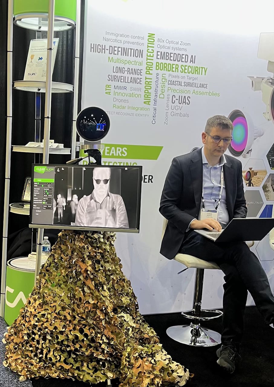 I take a surveillance selfie (it looks like I’m wearing shades!) at the Border Security Expo in Phoenix in April at the booth of the company Clear. This year, the expo featured Trump administration officials, including Border Czar Thomas Homan and Secretary of Homeland Security Kristi Noem. In her keynote Noem embellished about the president of El Salvador Nayib Bukele’s adoration of the United States via an epiphany he had at Target.