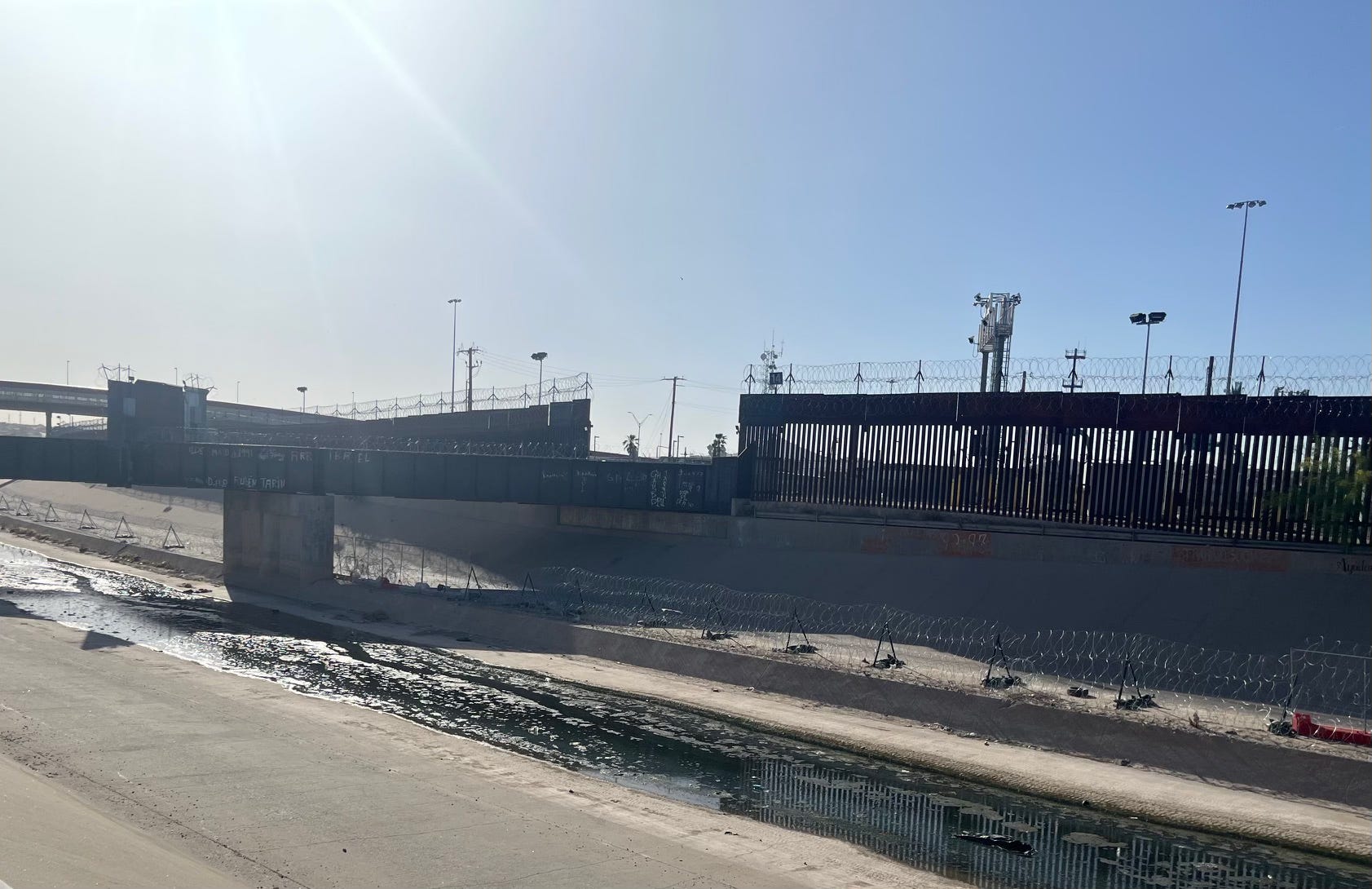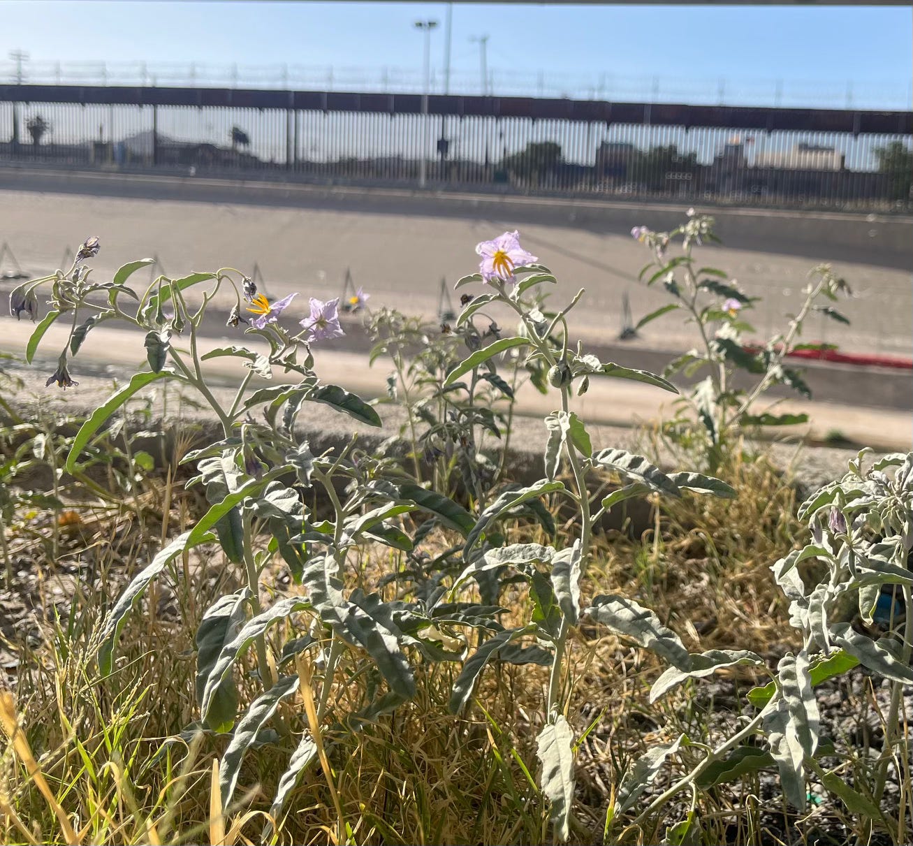 Finally, I had to take the 10-block walk from the convention center to the border, and cross into Mexico to see all this enforcement in real life and time. The trickle of the beautiful Rio Grande looked sickly as it traversed the heavily militarized border between Ciudad Juárez and El Paso (stationed on the Mexican side of the river was a small unit of the Guardia Nacional, who do not like their picture taken). The razor wire barrier (which you can see in the below photos, courtesy of Operation Lone Star) and the border wall gave the feeling of a fortress, especially for people (many of them presumably asylum seekers) staying in a tent encampment right across the river. Although the river lacked vegetation, the birds and a bunch of purple flowers (see last picture) showed that there is still an alternative to all this.