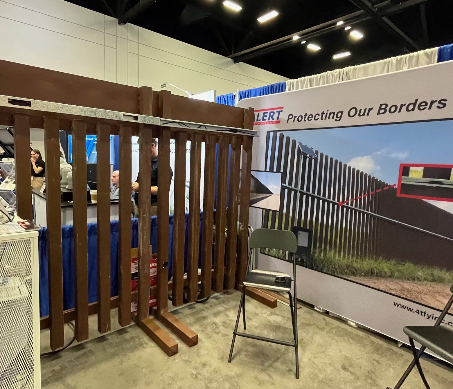 I don’t know if you caught this Border Chronicle article from a few weeks back about the Border Patrol removing razor wire from the border wall in Nogales, and that it might install new capacities as part of the wall’s maintenance. In the article, I wondered what those new capacities might be. When I visited this company, as you can see in the photo, they have a bollard wall model, which has a metal strip along the top that contains a black cable. This is a “smart wall” sensor that can detect if someone is touching the wall (or sawing through it, the vendor told me). I asked the vendor if this was deployed anywhere in the world. “The U.S.-Mexico border,” he told me.