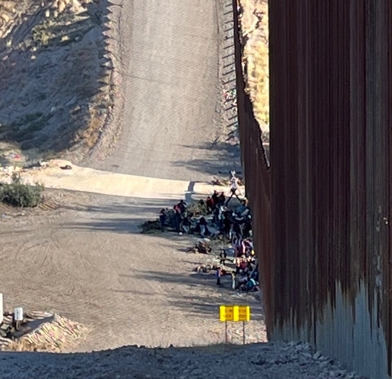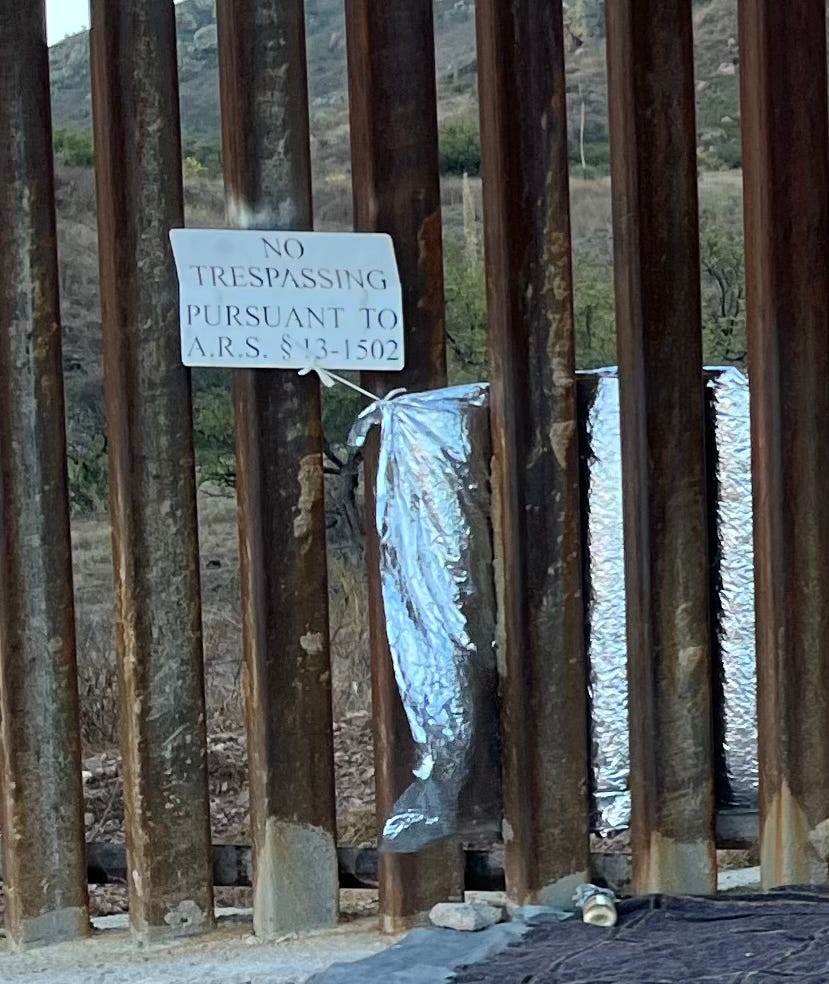 Off the side of the border road, there was a young woman cradling what turned out to be her sick one-year-old. Slowing down, we turned the corner and saw that she was part of a larger group, who were sitting on blankets placed on the dirt road against the towering 30-foot rust-colored border wall. We were to the east of Fresnal Peak (Cerro de Fresnal), about 10 miles from Sasabe, Arizona. The group had tied several ground cloths and blankets, including a white one from the Red Cross, to the bollards of the wall to tame the wind. The nights had been cold. They tied the last metallic-colored blanket to a white sign nailed to the wall that said, ironically, No Trespassing. To the east, the wall continued snaking up and down through the hills and mountains. This was the last part of wall that the Trump administration constructed during his waning presidency at the end of 2020. And this was the wall that the Biden administration was now finishing up.
