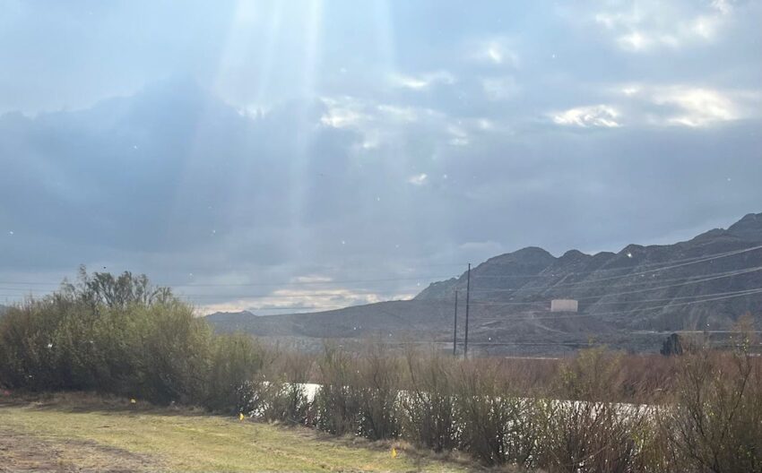 When we reached the Sunland Rio Grande site, artist Sandra Paola López Ramírez asked everybody to greet the river. It was a cold, windy morning, and rain spit down from a large, dark cloud that hung over El Paso and Ciudad Juárez. The river offering was the first event of World Water Week 24, an event inspired by the United Nations’ World Water Day (every March 22), which raises awareness about the 2.2 billion people on the planet who lack access to water. As I walked to the riverbank on the spongy, muddy ground, I could see the U.S.-Mexico border in the distance (a quarter mile to the south)—and its wall that follows the contours of the hilly and mountainous land. A Blackhawk helicopter, presumably from the Border Patrol, flew back and forth over the border. As I knelt in front of the Rio Grande, I looked at the greenish-brown rushing water, rippling with the continual fierce gusts of wind. When I first interviewed Paola in December, she told me that water is alive and ancient, and that it carries memory. She told me that when she crosses the border to Ciudad Juárez, she always walks over the bridge instead of driving, because she wants to see the river, the wall, the razor wire. “I feel the pain of the river,” she told me. “I feel the loss. It has moved me to do the work.”