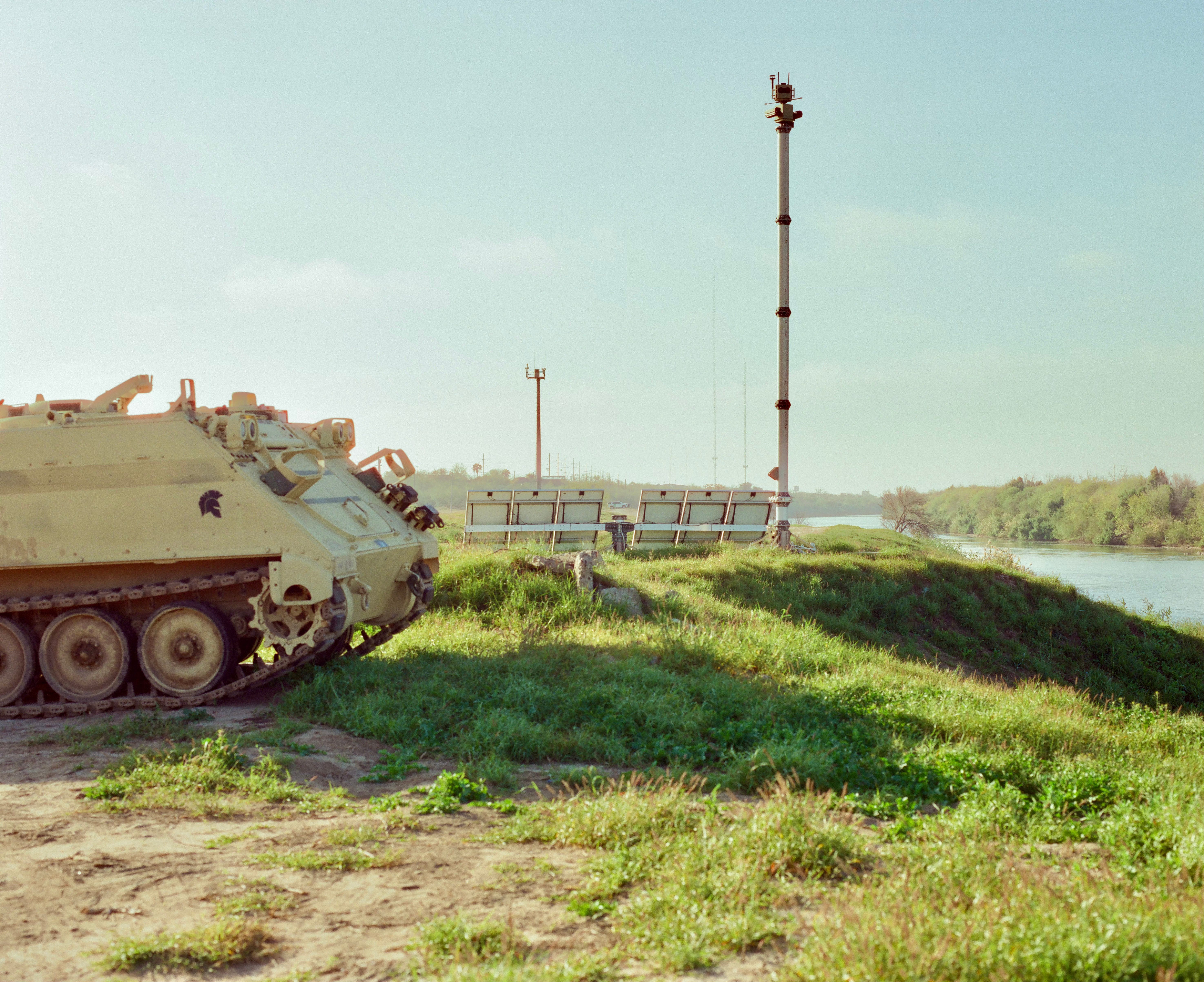 MEYER AND THOMAS: Few places along the U.S.-Mexico border encapsulate the sheer performative absurdity of our contemporary border security paradigm as well as this spot on the banks of the Rio Grande in Laredo, Texas. In addition to the two surveillance towers—inexplicably situated less than 800 feet apart, despite boasting effective ranges measured in miles—and the Border Patrol truck visible in the distance in the center of the frame, there are two tactical military vehicles sitting here as well, both silent and unoccupied. These are Texas National Guard M113 armored personnel carriers, “deployed” in this Laredo neighborhood as part of Operation Lone Star, Governor Greg Abbott’s made-for-TV, $4.5 billion (and counting) domestic military operation that has transformed thousands of Texas state troopers and National Guard soldiers into de facto immigration police. In his tweet showcasing the arrival of the M113s in December 2022, Abbott explained that they would serve as “enhanced protection for our troops in the face of increasing cartel activity.” But things seemed to work the other way around when Colter got too close to the vehicles and was warned away by two armed National Guard troops who looked to be in their teens. Why was he approaching the vehicles? To better photograph the decals that have been displayed on their sides since they arrived in Laredo: the head of a horse on one, a Trojan soldier’s helmet on the other.
